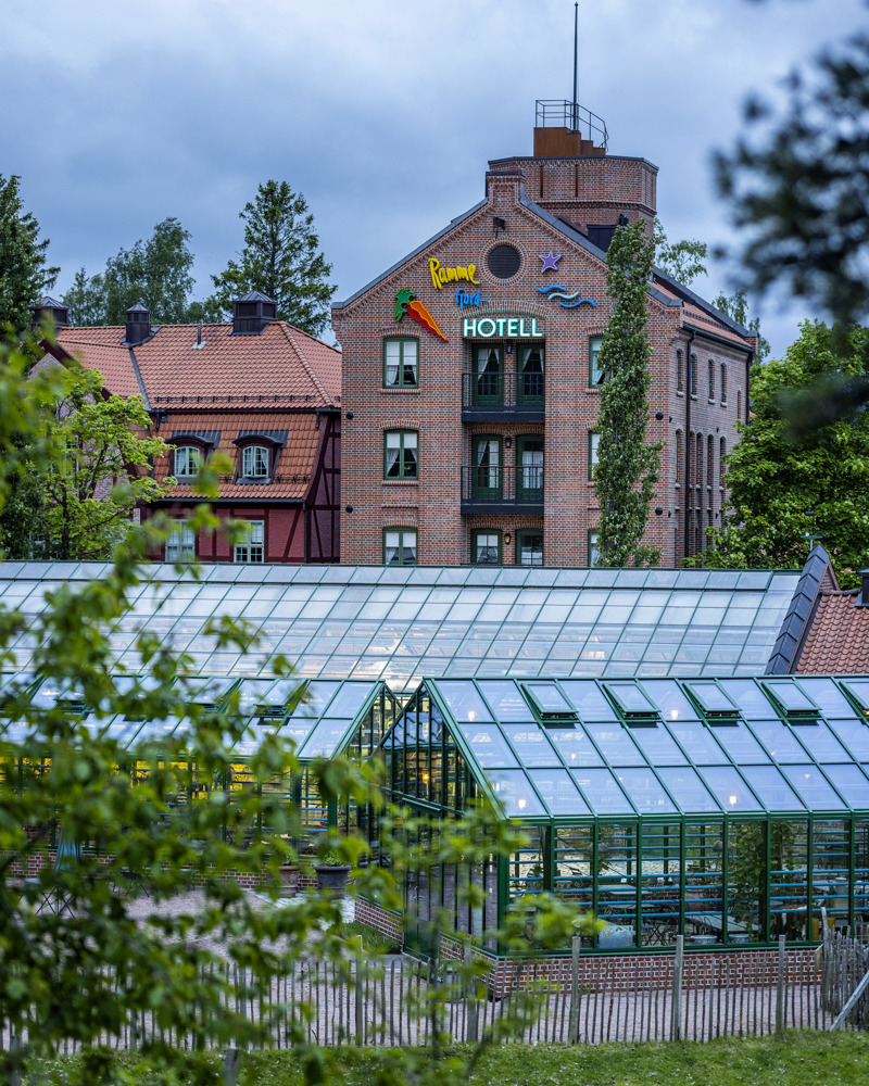 De nye hotellbygningene Brenneriet og Herberget med drivhusene i forkant.