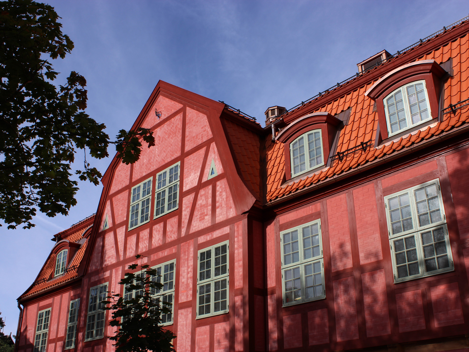 Nede i underetasjen har en lekker eldre garderobe fra Universitetet i Oslo som skulle kastes, fått et nytt liv i forbindelse med dagresepsjonen oppe. Stallen har sin egen stil, sveitserstilen, og selskapslokalet Den Gilde Hallen, som denne dagen huser konferansegjester, har fargepalett inspirert av et Frans Widerberg-maleri i trappeoppgangen. Bjelkene har franske låser. En trestamme har fått lov å bli stående midt i rommet og en drikkefontene med kildevann fra skogen står plassert i hjørnet.