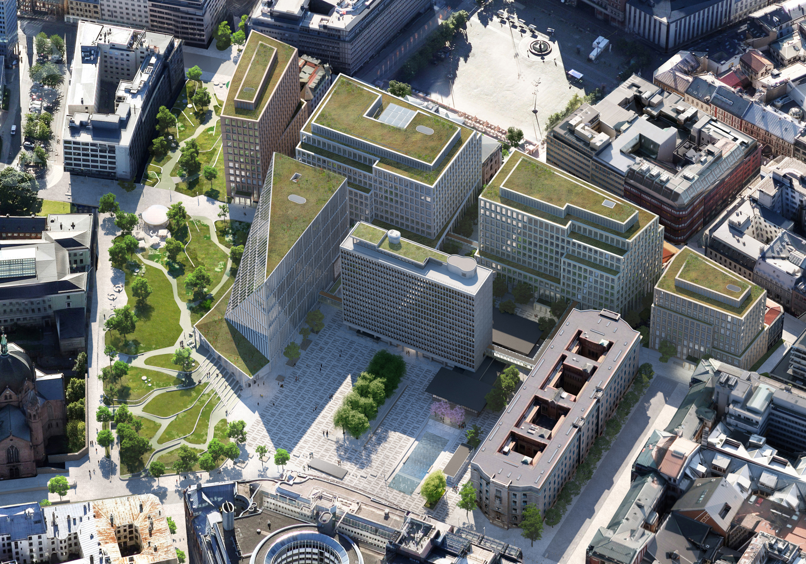 Akersryggen trer nå tydelig fram, og den nygotiske Trefoldighetskirken troner oppe på haugen sammen med det monumentale og nyklassisistiske Deichmanske og den tilnærmet klassisistiske svenske Margaretakyrkan. Med A-blokken foran, blir dette en herlig collage av mangfoldet av arkitektoniske utsagn som denne byen er sammensatt av. Mange har tvilt på parken, men sett høyt oppe fra de framtidige representasjonslokalene i Trekantblokken, synes et flott og tilgjengelig parkareal på Hammersborg å være en attraktiv mulighet.