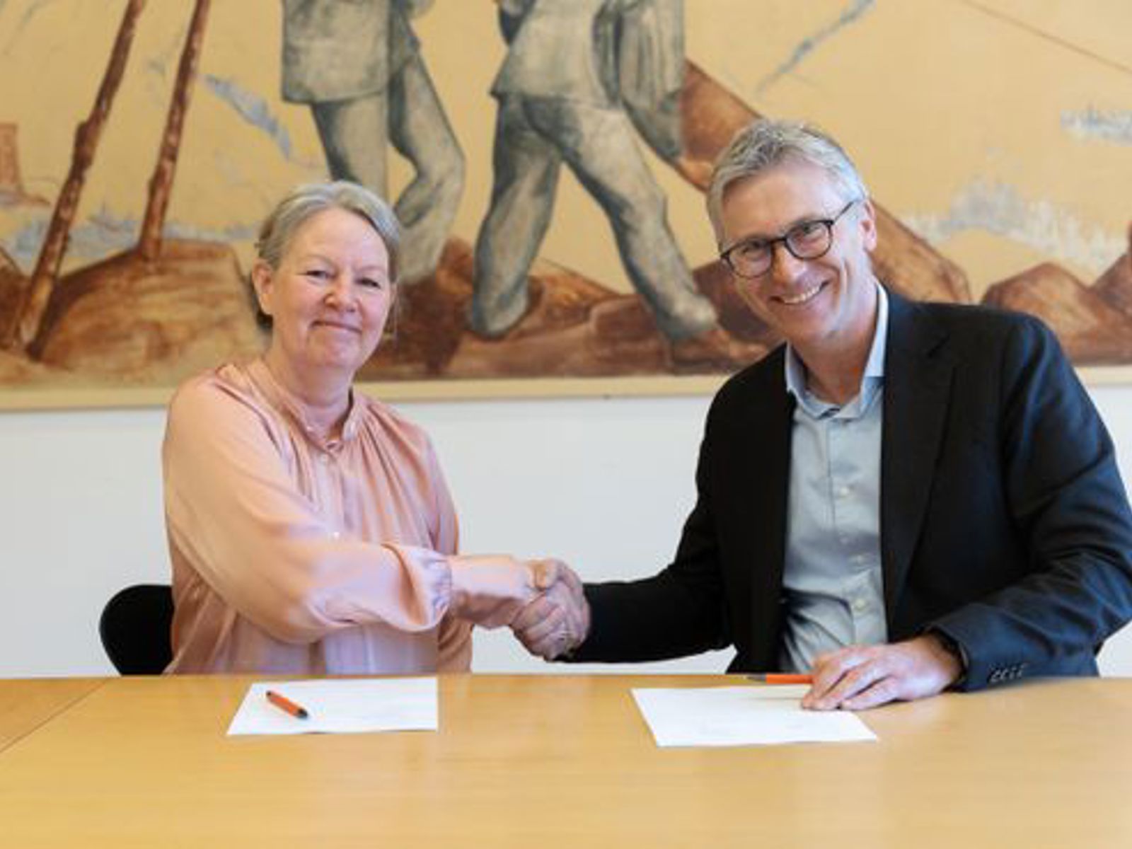 AHO-rektor Irene Alma Lønne (t.v.) og teknologidirektør i Kongsberg, Bjørn Jalving, da partene skrev under samarbeidsavtalen i begynnelsen av april 2025.