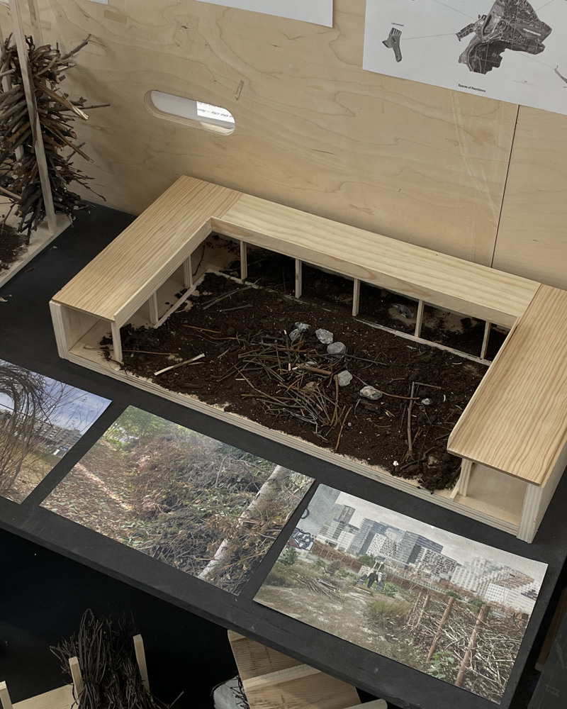 Mest talende for de nyutdannede studentene på AHO er ikke diskusjonen om forholdet mellom arkitekturhistoriske epoker, men heller forholdet mellom menneske og natur. Det gjør seg gjeldende i landskapsprosjektene: Inge Rosén Langdalens refleksjon rundt kartlegging, eller Nipun Hettiarachchis diskusjon om ras-sikring. Hvordan ser man landskapet fra et villsvins ståsted, spør Lai Ching Ng, som har laget parfymer fra lukter hun har sanket i Hong Kongs skoger.