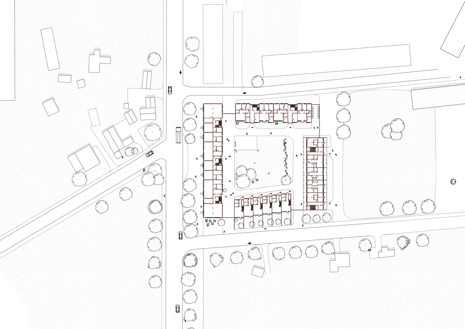 Situasjonsplan som viser hvordan de modulbaserte pilotene kan kombineres og danne et nytt kvartal i Irpin.
