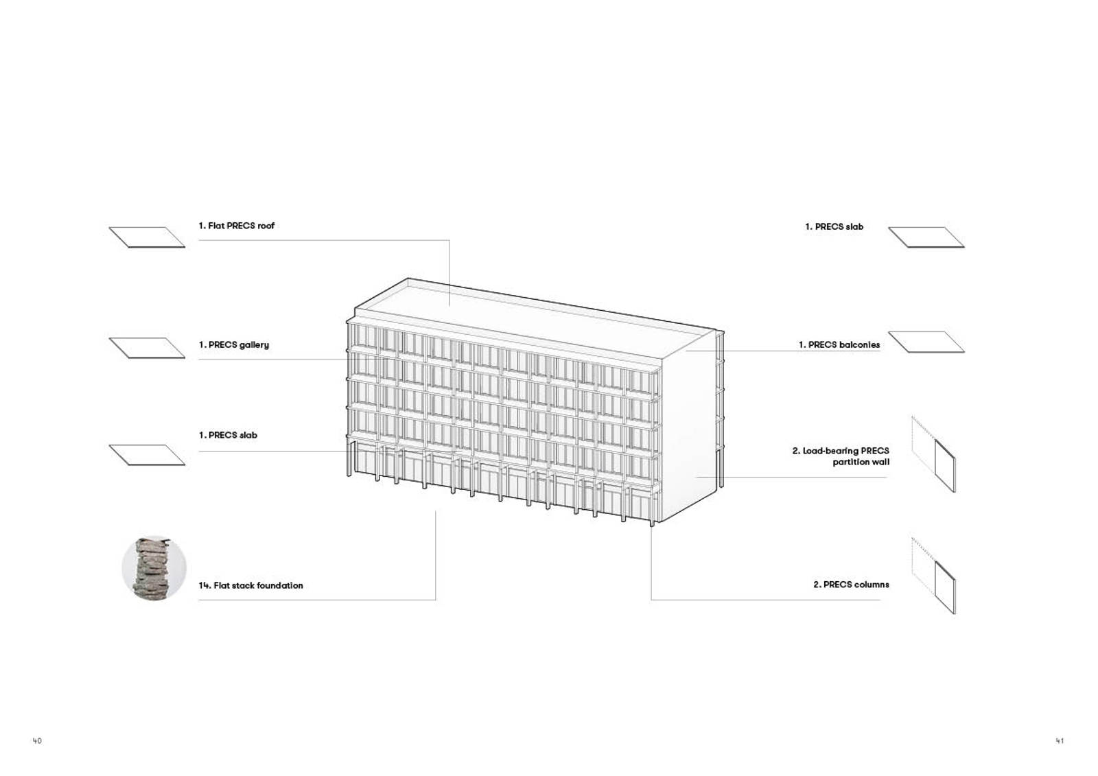Aksonometrisk illustrasjon av én av tre pilotprosjekter: Gallerihuset. Piloten er basert på gjenbrukte, prefabrikkerte betongelementer fra demonterte «sovjetblokker».