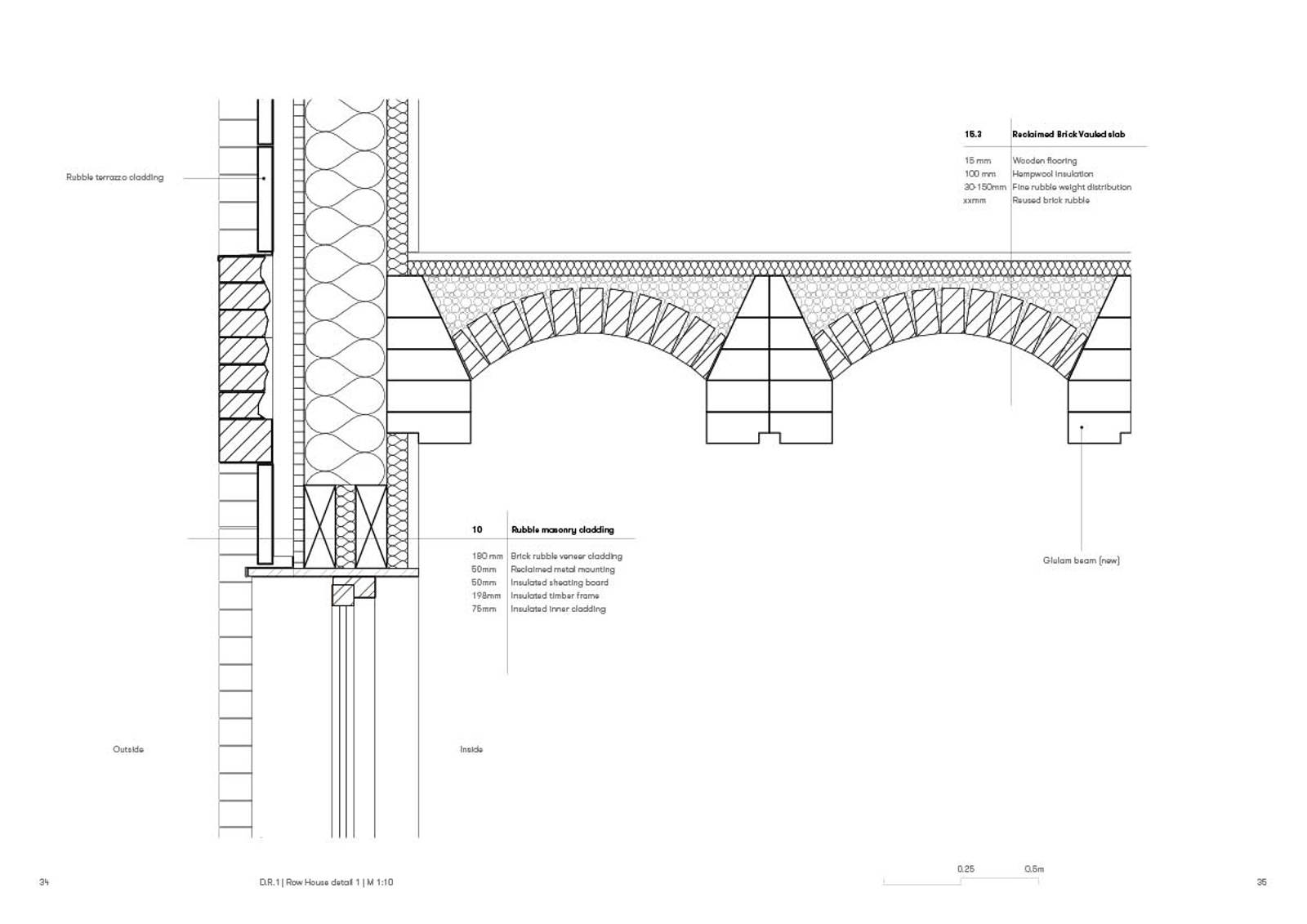Tegningen viser en detalj fra rekkehus-piloten, utviklet med utgangspunkt i gjenbrukte materialer fra ruiner i Irpin.
