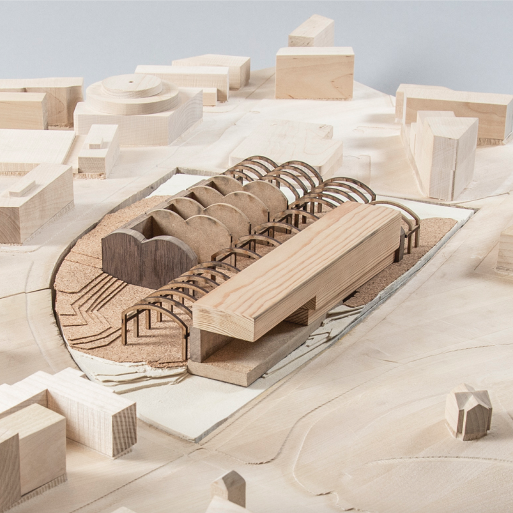 Inge Wiigs prosjekt er en formstudie, der radioens lydbølger har fungert som inspirasjon til en bølgeformet bygning med terasser i ulike høyder. Illustrasjon: Inge Wiig