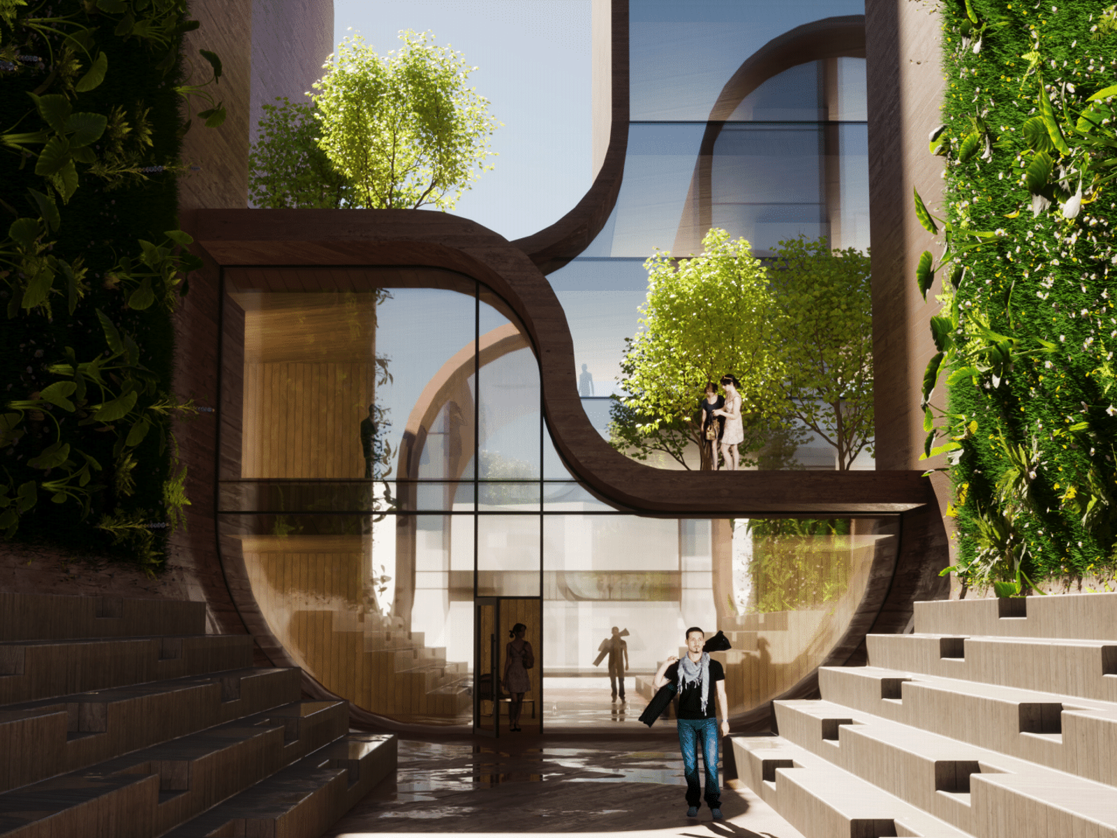 Johannes Moe har latt en konsertsal fungere som hjertet i bygget. På sluttgjennomgang ble prosjektet omtalt som «en troverdig blanding av kontorbygg og noe monumentalt», forteller studenten. Illustrasjon: Johannes Moe