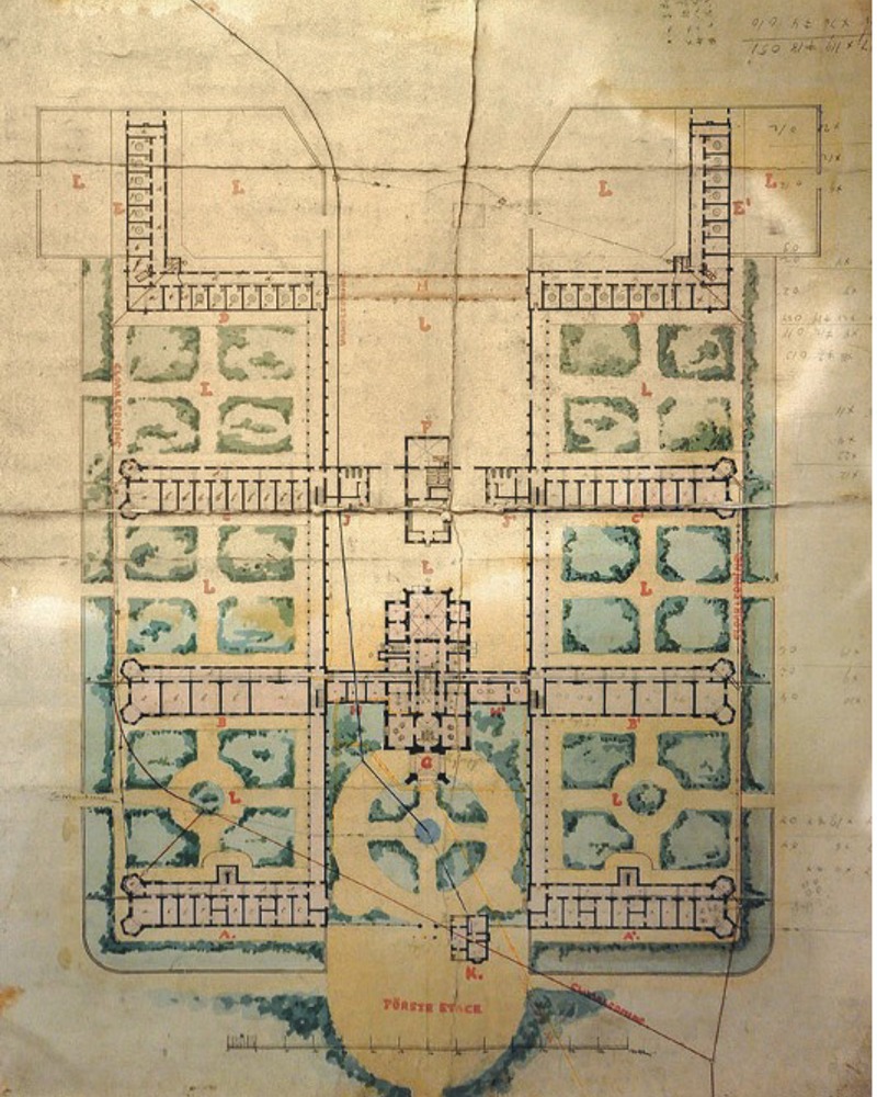 Herman Wedel Major og Heinrich Ernst Schirmers plan for Gaustad med hageanlegg mellom frittstående avdelinger.