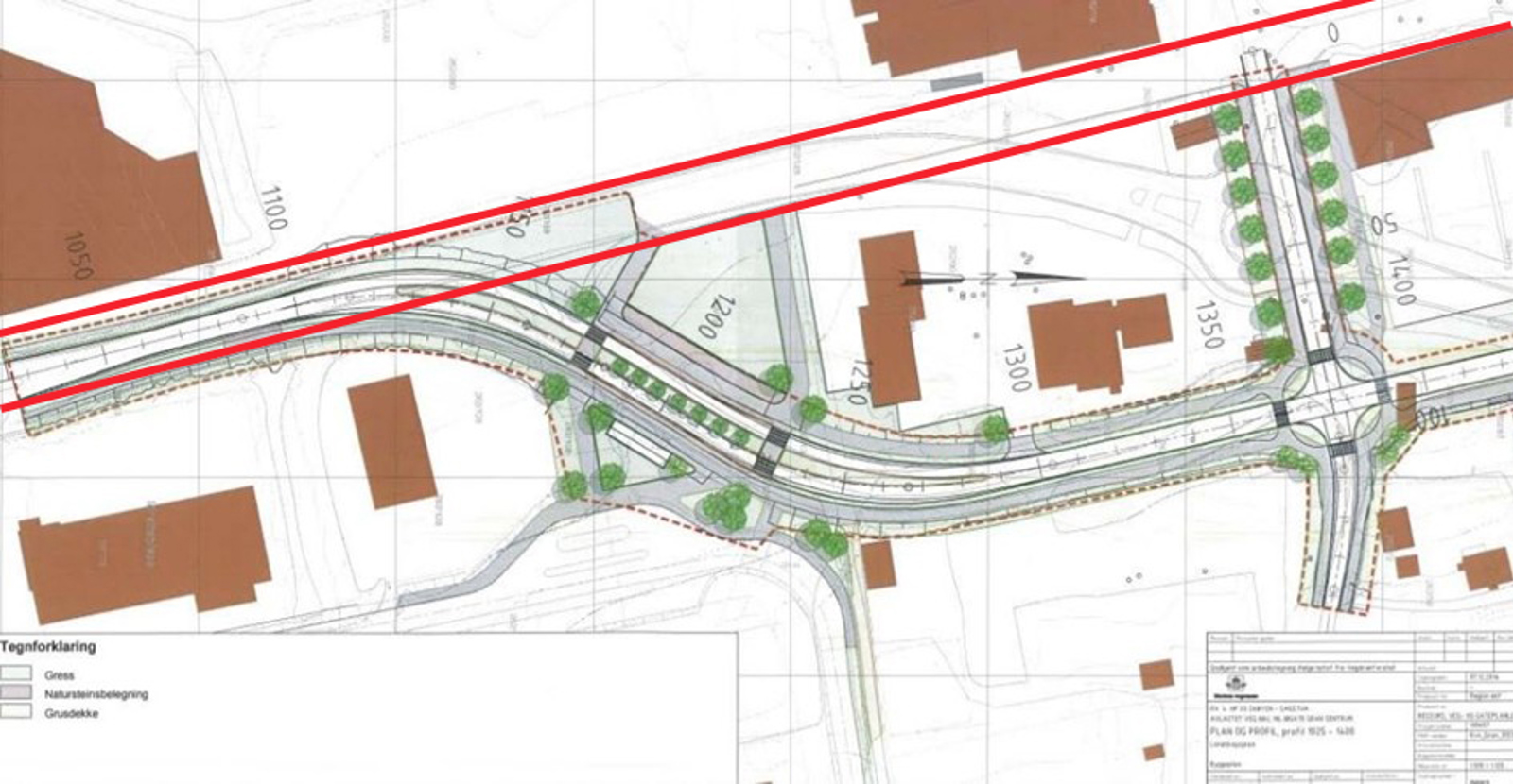 Detaljprosjektert løsning for deler av miljøgata på Gran (SVV)- Oslolinna og Storgata markert med rødt.