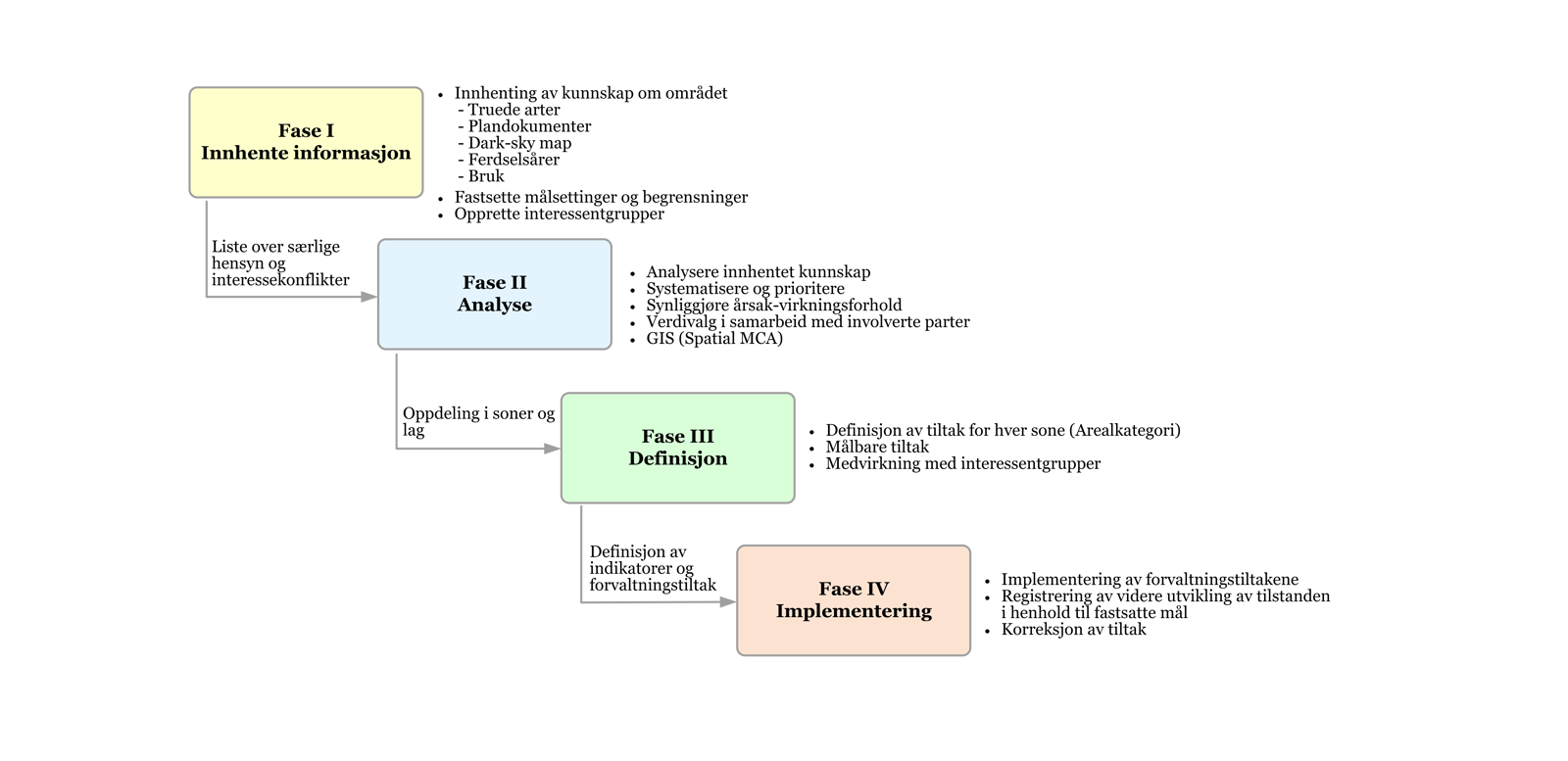 Fase 2 avsluttes med en oppdeling i soner, der de ulike kartlagene (GIS) analyseres av en sammensatt gruppe med ulike fagfelt (lys, biologi, interessenter, planleggere) og med innsikt i lokale hensyn.