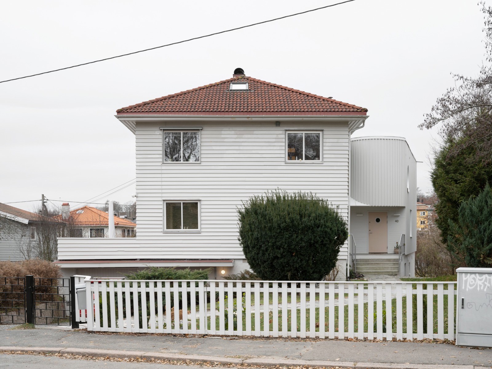 Tilbyggets runde form skiller seg fra det opprinnelige byggets kantete funksjonalisme.