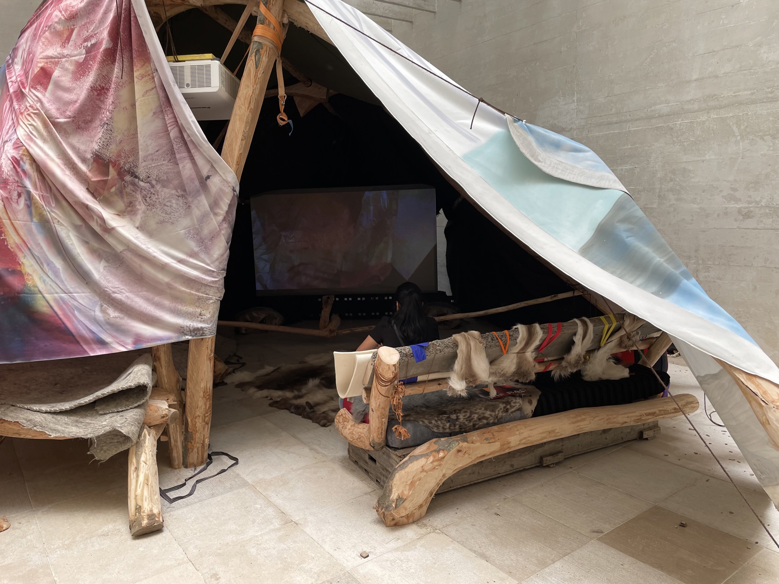 En del av sedertreet har også blitt bunnelementet til det Nango omtaler som hjertet i utstillingen: Et bord, laget av en skiferplate fra det opprinnelige gulvet i paviljongen, som har fått sydd et trekk av håndgarva reinskinn, sydd av den samiske kunsthåndverkeren Katarina Spik Skum.