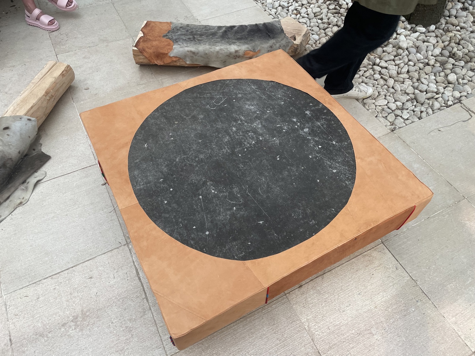 På baksiden av paviljongen fant Nango en stein fra Fehns originale skifergulv. Det har blitt til et bord med trekk av håndgarva reinskinn, sydd av den samiske kunsthåndverkeren Katarina Spik Skum.
