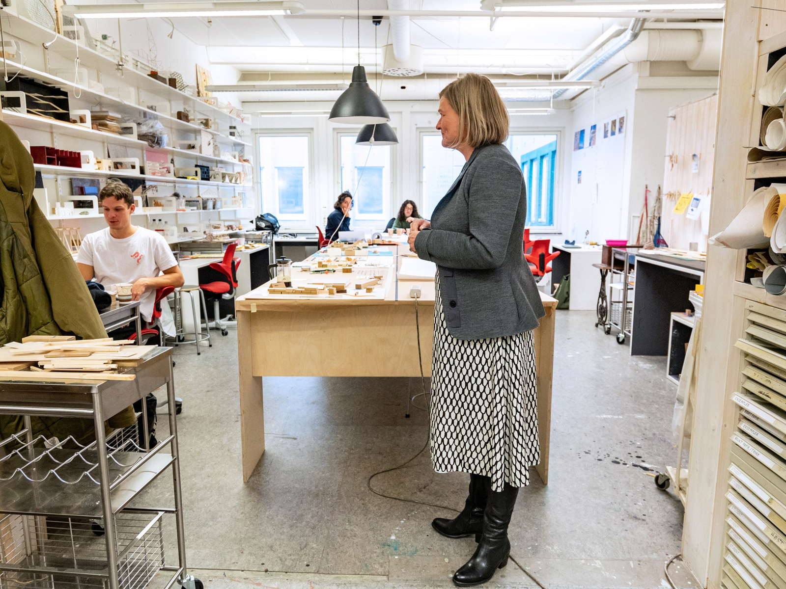 Dekanen i prat med arkitektstudenter. – Det er en kjempeutfordring å greie å rekruttere bredere, sier Skjulhaug, som ønsker seg mer mangfold blant arkitektstudentene. At det kanskje også fører til kulturendring i faget, mener hun bare er bra.