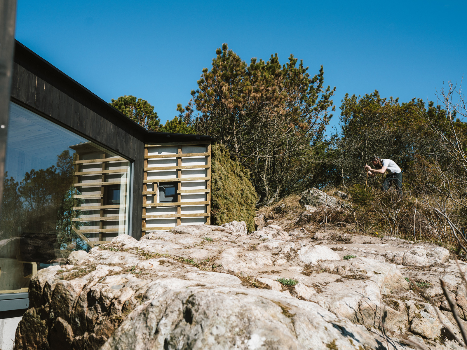 På en ny hytte i strandkanten har arkitektene fått kunden med på å kle deler av veggen med einerbusker, såkalt brakjekledning. – Det har en kamuflerende effekt. I tillegg har det noe å si for biomangfoldet, det skaper et sted hvor insektene kan være. Og så beskytter det mot regnet, forteller arkitektene.