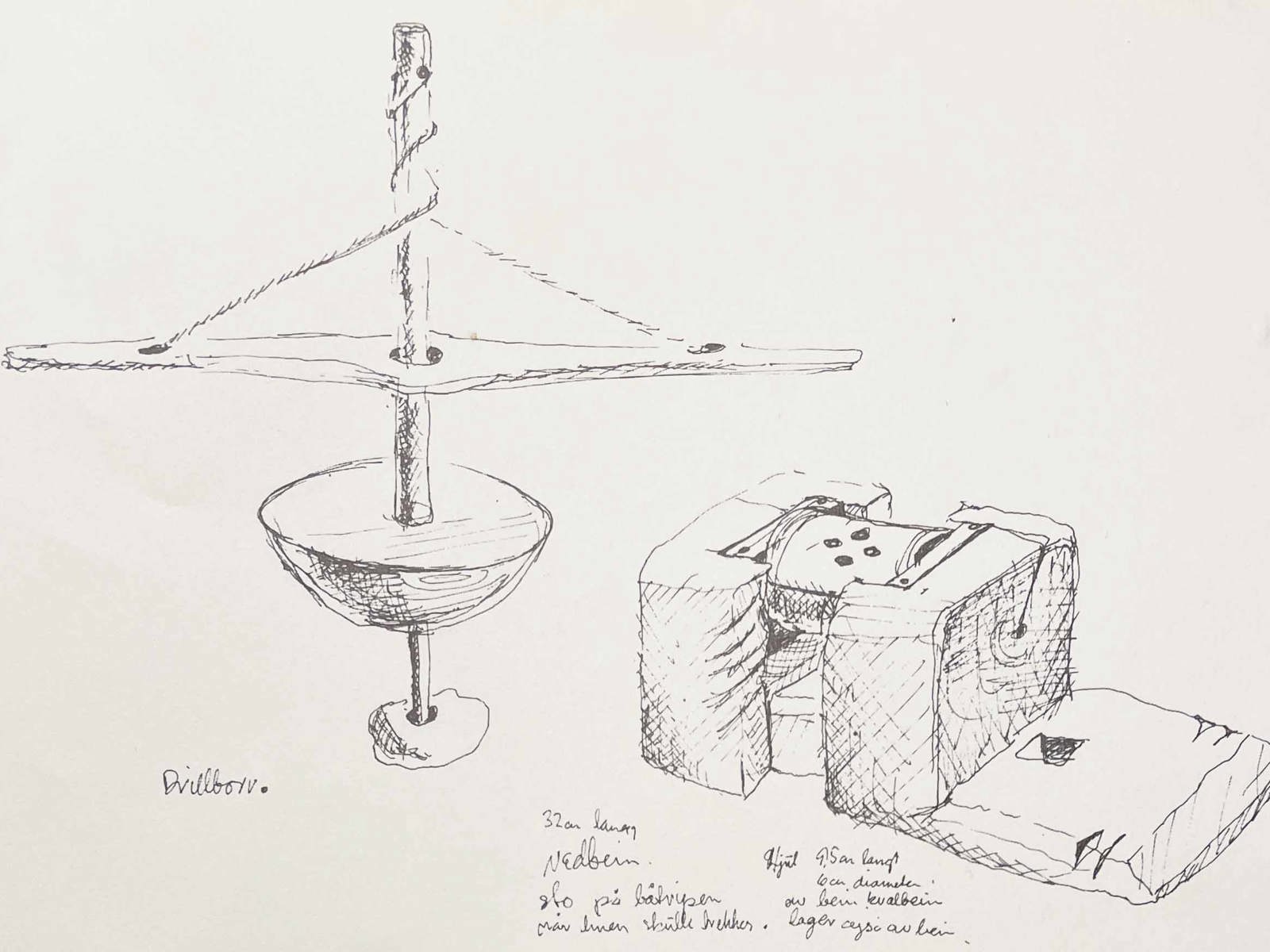 Drillborr for hull i kleberstein til synkegarn. Vadbein festet til båtripen hvor snøret gikk over et hjul av kvalbein. Fra Staven Øygarden kommune.