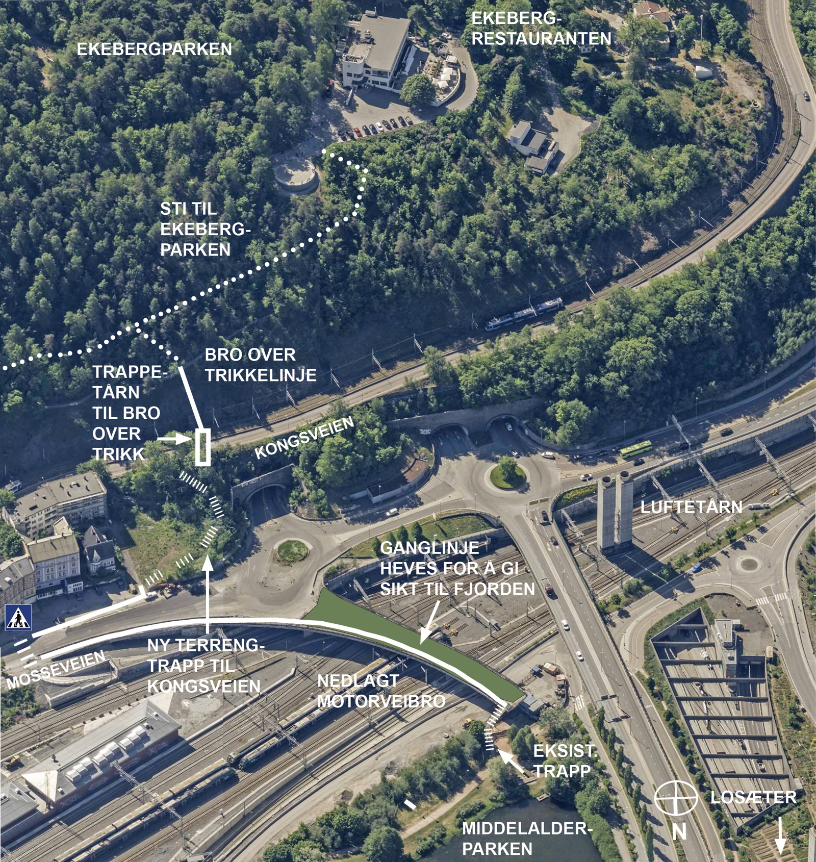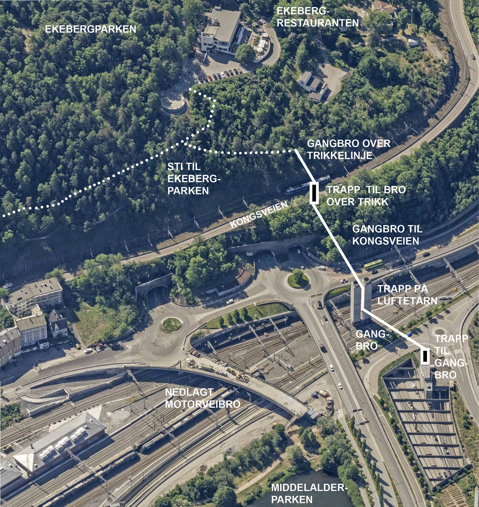 Studentprosjektet viste at et hevet gangstrøk ville få flott utsikt mot byen og fjorden. Forslaget om en trapp ned til Middelalderparken og broen som del av en ferdselsåre til Ekebergparken, var ett av flere alternativer i en mulighetsstudie utført av Ghilardi+Hellsten og White arkitekter for Plan- og bygningsetaten i 2015. Rødt-politiker Kay Asbjørn Schjørlien fulgte opp.