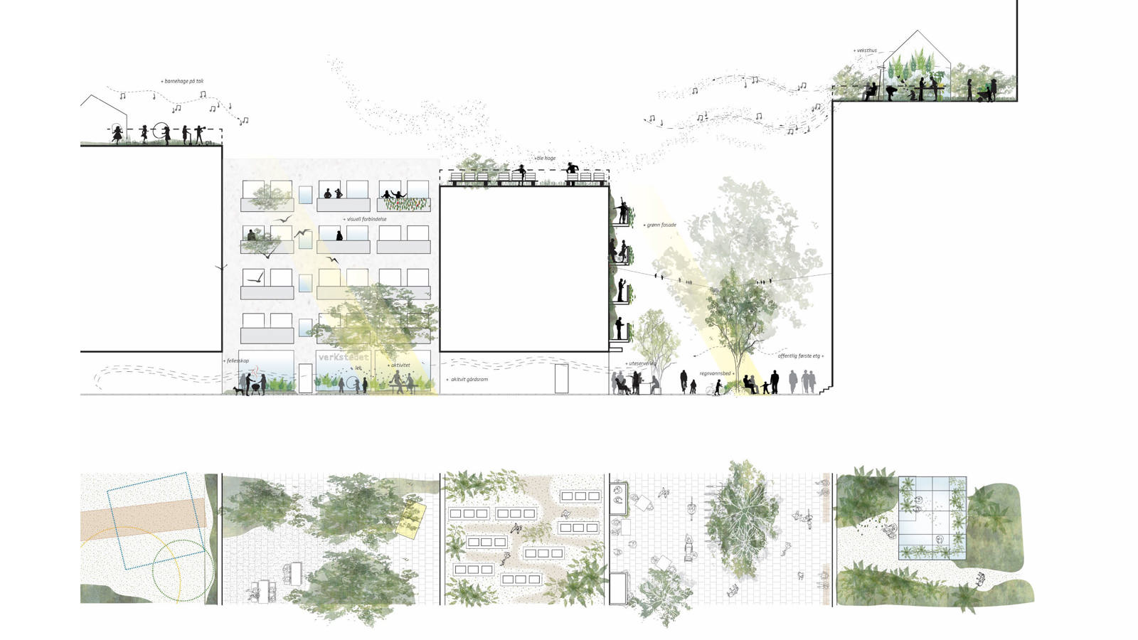 Helt konkret har vi utviklet et forslag for Kvadraturen, hvor de historiske grå veirommene for biler transformeres til grønne gater og levesteder for mennesker og natur.