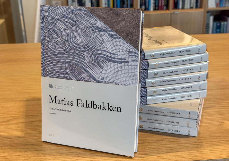 Boken omhandler kunsten, stedet og den konkrete prosessen med å planlegge og legge mosaikken. Faldbakken har selv skrevet hovedteksten om sitt eget verk, «Et portrett av gjeld», og Maria Reinertsen Berg, journalist og forfatter, bidrar med essayet «Hvem er den skyldige?» Boken er illustrert med både tegninger og foto av Faldbakken.